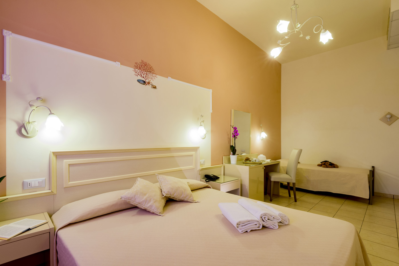 Tutto il comfort della nostra camera Family abbinato ad ambienti più generosi che permettono di avere una camera matrimoniale e cameretta bimbi (con 3 letti singoli) adiacente, senza porta divisoria, e 2 bagni privati. 31 mq. 3 letti singoli. Camere dotate di aria condizionata e riscaldamento centralizzato, 2TV lcd, connessione Wi-Fi gratuita e minifrigo. Balcone, cassaforte, box doccia, asciugacapelli, pulizia giornaliera, telefono con collegamento esterno. Balcone fronte mare. Anche se amiamo gli animali domestici, purtroppo non possiamo ospitarli.