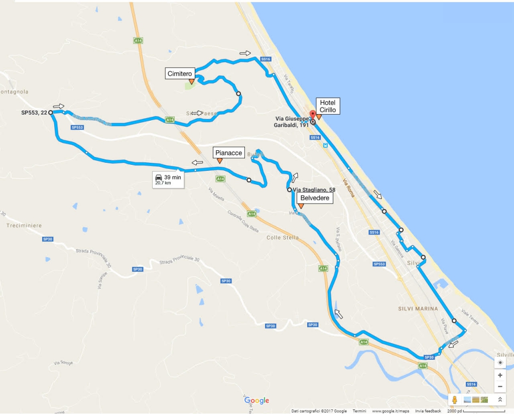 Arrivati vicino al borgo di Silvi Paese, si svolterà sulla destra per poter iniziare la discesa più ripida, sulla quale è consigliabile moderare fortemente la velocità. Avvicinandosi al cimitero sarà necessario ridurre la velocità in maniera significativa, per poter gestire i due tornanti particolarmente stretti. Una volta immessi nuovamente sulla nazionale, si percorre l’ultima piccola salita, e si rientra al nostro Hotel.